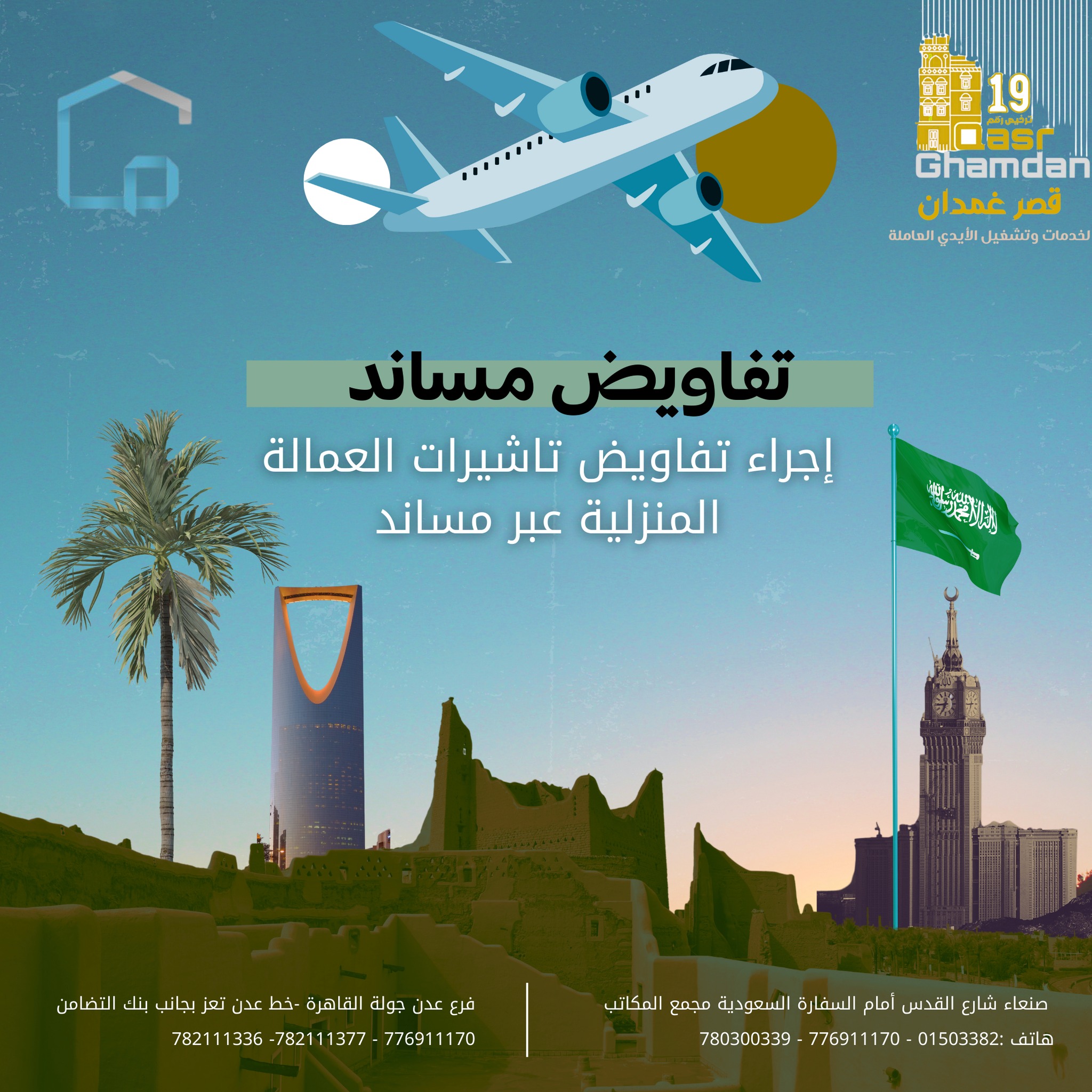 ‏معتمد لدى مكتب الشؤون القنصلية بجدة لبعثتي المملكة في صنعاء وعدن بترخيص رقم(36) لتخليص جميع المعاملات المتعلقة بـ أجراء تفاويض تأشبرات العمالة المنزلية عبر مساند